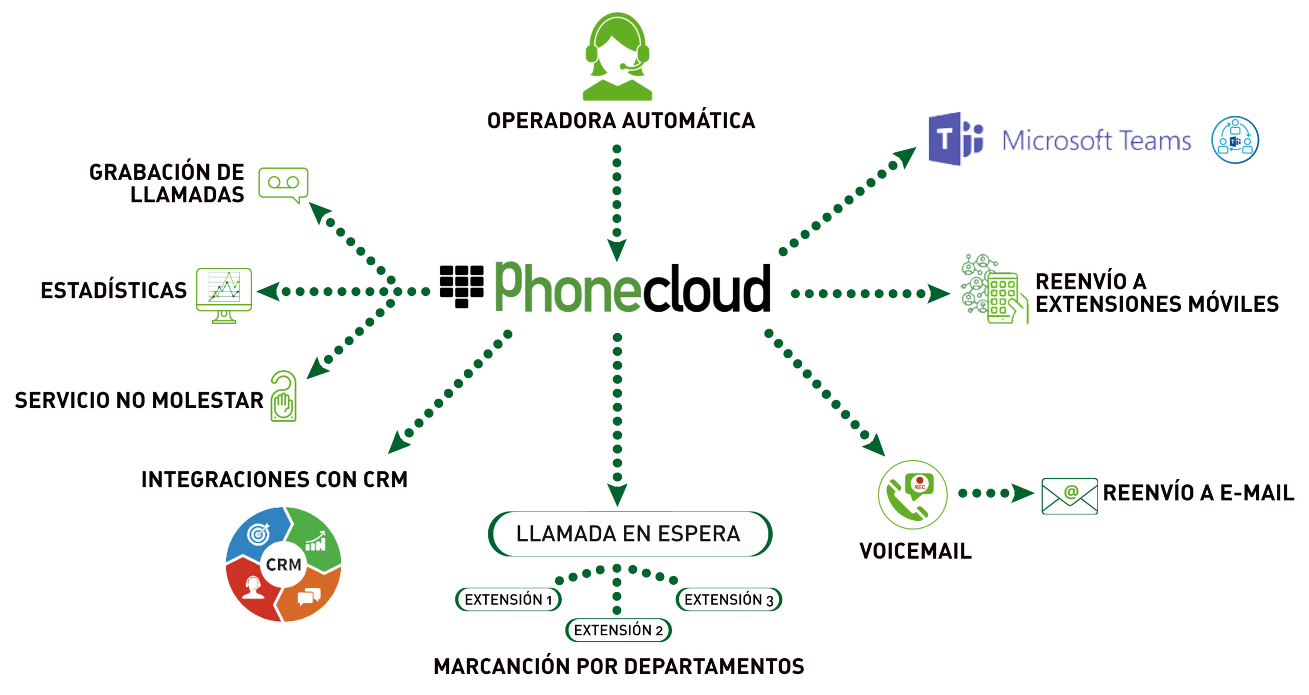 La Centralita Virtual PhoneCloud, es un sistema de telefonía de Voz sobre IP con todas las funcionalidades de un centralita tradicional a un menor coste. Esto es debido a que no es necesario instalar ninguna máquina en su Empresa, ésta se encuentra alojada en la Nube. Al no estar compuesta de material físico, su coste de mantenimiento es mucho más reducido que cualquier otro tipo de centralita.